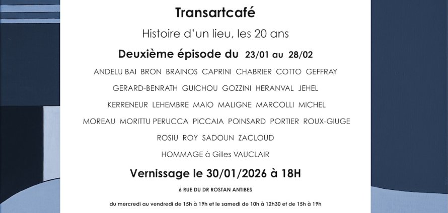 D’Abril à Zacloud, ce n'est pas moins de 40 artistes qui se succéderont aux cimaises du Transartcafé pour fêter ses 20 ans d’activités. Sise au cœur du vieil Antibes, cette galerie associative propose tout au long de l’année des expositions, des soirées, des rencontres… Toujours dans cette démarche de relier artistes, écrivains, d’expression et de culture différente, l’équipe du Transartcafé, dans ses choix, participe au développement d’autres circuits de création.Du 28/11 AU 20/12/2025 et du 06/O1 au 28/02/2026 - Vernissages : le 05/12/2025 et le 30/01/2026.